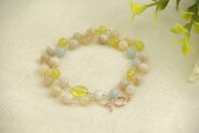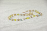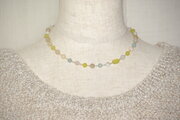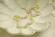 イエロー、ミルクホワイト、水色の組み合わせが気持ちを上向きにしてくれるネックレスです。形の異なる2種類のサーペンティン、表情豊かなモンタナモスアゲート、アクアマリンを色のバランスを考えて配置し、ワイヤーでひとつひとつ丁寧に眼鏡留めしました。華奢に見えますが、安心感のある作りになっています。これからの季節、フラリとお出かけしたくなるような気分にさせてくれるネックレスです。二連にしてブレスレットとしてもお使いいただけます。