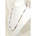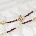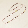 明るい赤の色合いと透明感が美しい高品質のガーネットと、照りの美しい貝パーツ(マザーオブパール、白蝶貝、アバロンシェル、あわび真珠、フラワーモチーフ)、クロスモチーフの本真珠(淡水パール、バロック)、ボタン型の本真珠(淡水パール、ナチュラルカラー、ホワイト)、輝きの綺麗なヘマタイト(多面カット、ゴールドメッキ)のロングネックレスです。