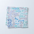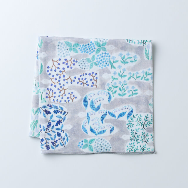 たくさんの渡鳥たちの中に季節ごとの植物を描きました。青のトーンで落ち着いた印象の柄です。