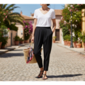 ●❤ひんやり心地で気持ち良い接触冷感❤穿き心地抜群⤴美脚快適テーパードパンツ:1サイズで7~13号対応!黒ピュアブラックを1本