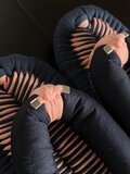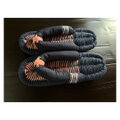 【ふちどりデザイン】24.5cm 布ぞうり ブラック ブルー系 グレー【No.321】迅速なご対応ありがとうございました。思っていたより早く届いて(自分用ですが)まるでクリスマスプレゼントのようでした。新年から履くつもりでしたが、嬉しかったのでクリスマスから履くことにします。 昔から布ぞうりを愛用していますが、こんなに端正なものは初めてです。靴は25㎝ですが24・5で丁度よかったです。鼻緒が太くてあたりが柔らかく、左右があることにも驚きました。 楽しみに履かせていただきます!