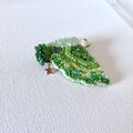 緑がうつくしい季節、お花だけでなくたくさんの緑が花やぐ見ているだけで元気になる色合いの羽を持ってる鳥さんです。みどりの部分には主に太さのあるふっくらとした糸を使っています。羽の先には、ちいさなスパンコールをつけています。