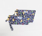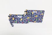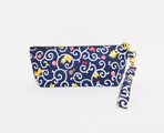 ネイビーの綿ブロード地に唐草の中を元気に遊ぶ豆柴君柄の持ち手付きペンケースです。