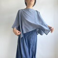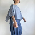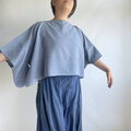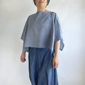 四角い布を組み合わせたシンプルなつくりに短い着物風の袖をつけた、丈の短めのプルオーバーブラウスです。着物の作りを参考にした袖の下の部分が大きく開いたつくりで、余裕があってゆったり着られます。