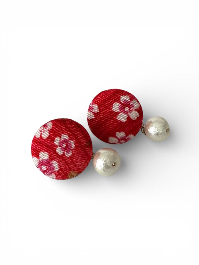 《イヤリング》真っ赤なちりめんの紗綾形に小さな可愛い白桜とコットンパールの包みボタンのイヤリング