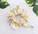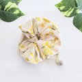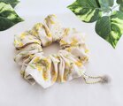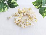 ベージュの綿リネン生地に可愛いミモザの花柄大き目サイズのシュシュです。