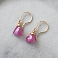 マダガスカル産ピンクサファイアのトライアングルブリオレットビーズを使ったピアスです。表面両側には三角形のカットが連なるローズカットが施されており、少しの動きでキラキラと美しく輝きます。 派手すぎない上品なくすみのあるレッド~ピンクカラー、うっすらと透明感のあるつるんとした果実のような艶、とても魅力的な表情をみせてくれる素敵な石です。