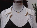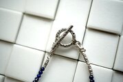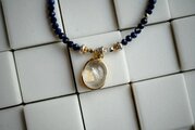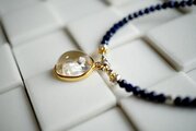 直径2.5mmのボタンカット型ラピスラズリを連ねたネックレスは光を受けてきらきらと美しく輝きます。中央部分には小さなシルバーとゴールドのビーズを並べてアクセントにしています。この部分にクリスタルのトップが下がっています。