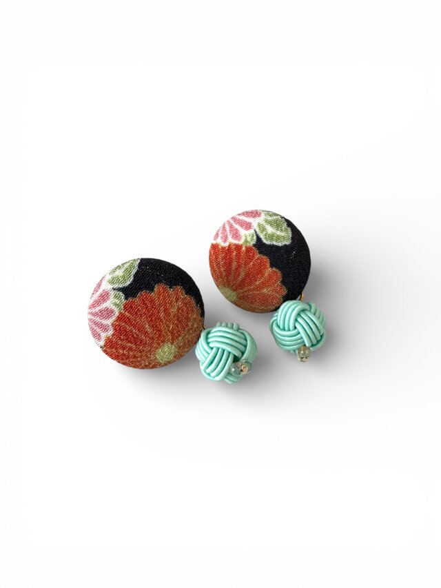 《イヤリング》京都一越ちりめん・黒地にインパクトある菊の花の包みボタンピアス☆世界に一つのデザイン