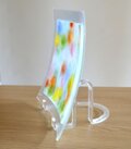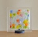 コーティングしたガラスに、ガラスの粉を焼き付けたガラスを合わせています。フュージングの技法を使っています。