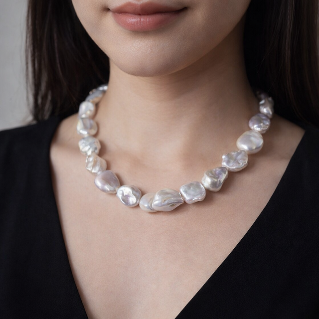 貴重な、大粒のバロック真珠を使用しています。