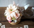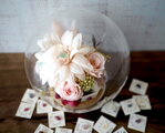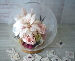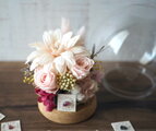 コロンと丸くて可愛いガラスボトルの中に上質なアーティフィシャルフラワーのガーベラ、ローズなどでアレンジした誕生石のフラワードーム。