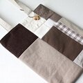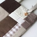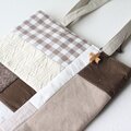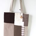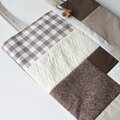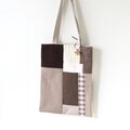 茶系、ホワイト系の色々な素材の生地をパッチしたA4サイズの肩がけトートバッグです。