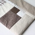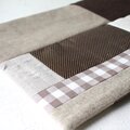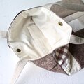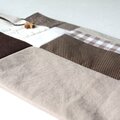 ベージュの帆布や茶系のドット生地、ウールツィードなどをポイントに、色味の異なったリネン、白のリネンなどを丁寧にパッチしました。