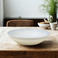 手描き深皿 縁青十草【砥部焼】は、熟練の技が光る一品です。職人の手によって描かれた十草模様は、呉須という顔料で緻密に表現されています。線と線の間隔を均一に描き上げることは、熟練の技が必要であり、その技術の高さが器の美しさに表れています。マット釉と呉須の青が絶妙なコントラストを生み出し、洗練された雰囲気を醸し出しています。