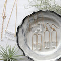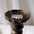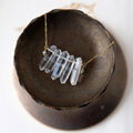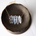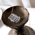 氷柱のようなダブルポイントクリスタルを並べ、サイドにパールとジルコンを配した繊細なデザインのネックレス。クリスタルはカットされていない採掘されたままの姿。ごつごつした部分や気泡、インクルージョンも見られますが氷の様な透明感があり胸元で美しく輝きます。