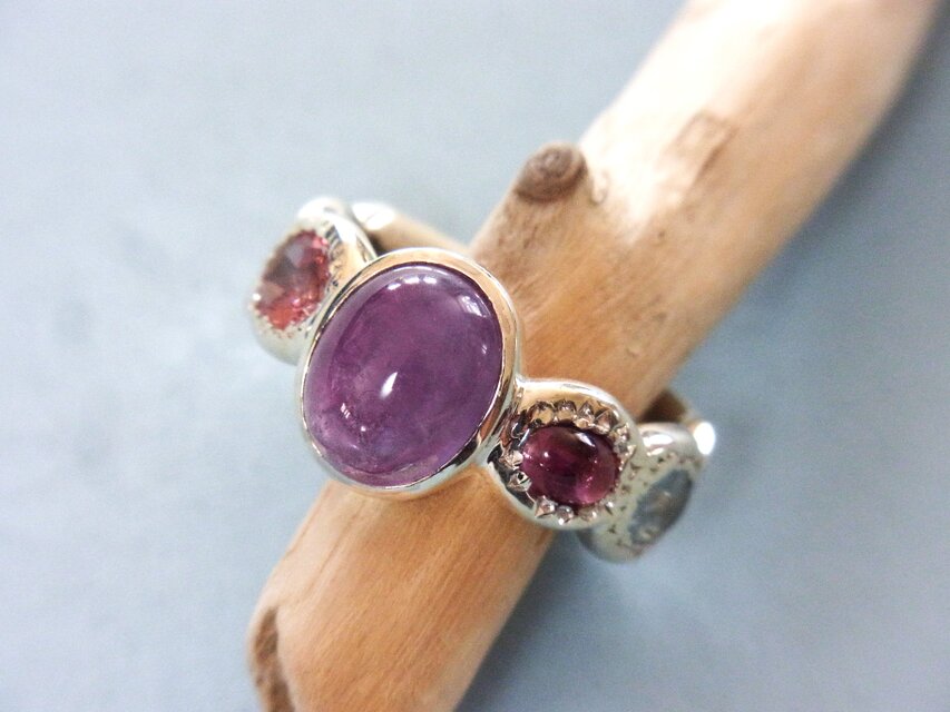 ピンクトルマリン0,7カラットと二個のカボッションカットのアクアマリン1,09カラットが