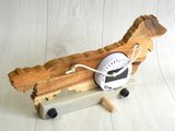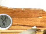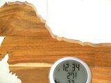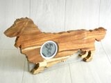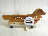 ダックスフンド(ロングコート)の姿を模った木製のデジタル温・湿度計(時計付)です。