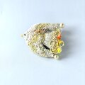 尻尾には、オレンジ、グリーン、イエローとカラフルな引き揃え糸を使いました。お目目は緑色で、胸元や羽のあたりには艶やかなガラスビーズやきらりと輝きのあるものを散りばめています。