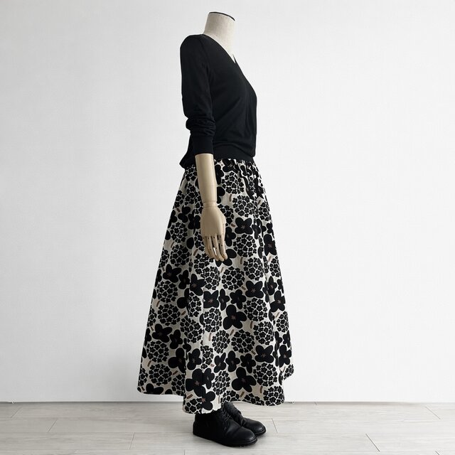 丈が選べる ギャザーフレア ロングスカート|コットンリネン_北欧風ブーケ柄