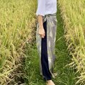 LAST1 ・シルクレーヨンスカーフ「稲」オイシイネ!AMONGさまのスカーフどれも素敵なのでどの柄にしようか迷いましたが、この稲の柄にしました。首に巻いてみたところ3色が絶妙のバランスで入っていてオシャレな装いに見えます。ネイビーと黄色も良い色ですが、意外とミルクコーヒーのような茶色?がお気に入りです。