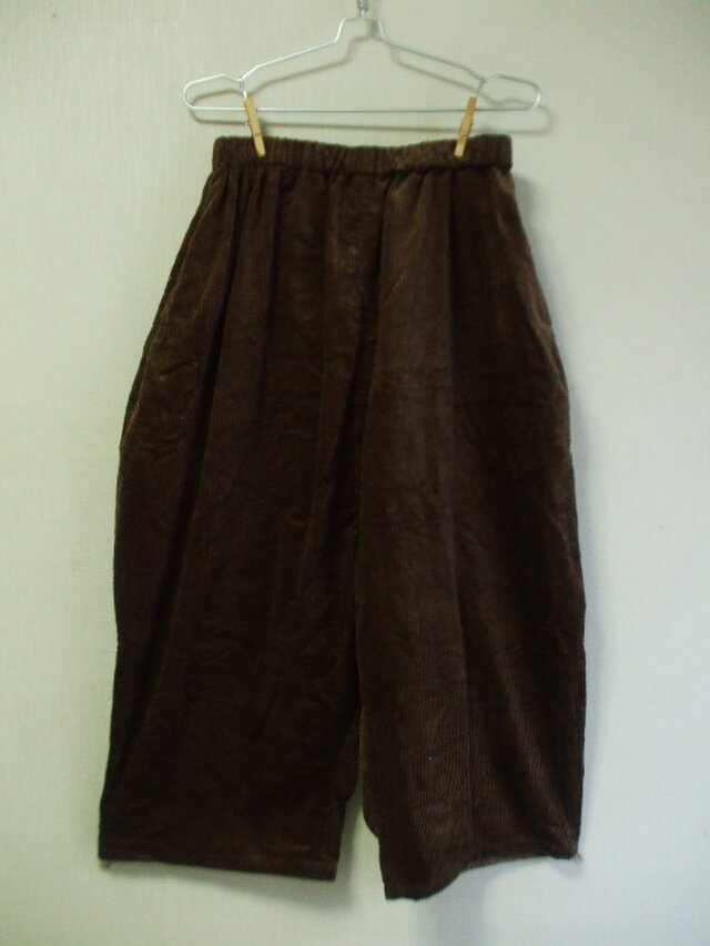茶色の太目のコーデュロイ生地のサルエル風パンツです♪横に2個,後ろに2個ポケットが付いてます♪