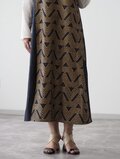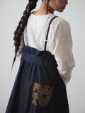 両サイドにスリット入り、バックスタイルはウエストより上でギャザーを寄せて留めてあり、広がり過ぎないバランスに仕上げています。ブロックプリントが施されたポケットが片側だけ付いています。