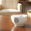 素材は美濃焼の陶器で、白い色合いに光沢があり、少し凹凸のある青い模様も入っています。手作業が多いため、模様の入り方や色味が異なる場合がありますが、それが味わい深さを生み出しています。