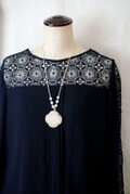 ネックレス部分は約2〜3mm角のアンティークビーズとヴィンテージの粒ビーズを交互に通し、ネックレスの中央部分には美しい光と輝きを放つ淡水パールを6粒通しています。アンティークビーズは内側に光を纏った様な輝きがあります。