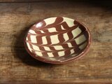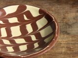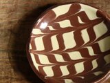 素地にクリーム状の化粧泥で模様を描いてから淡黄釉を掛けて焼成しています。