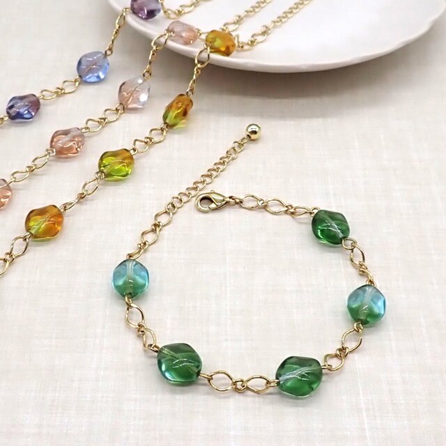 凹凸のあるオーバル型のチェコビーズとデザインチェーンの透明感のあるブレスレットです。