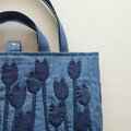 濃紺デニムのチューリップを前面、マチ、後ろ面ポケットに計21本をアップリケ。