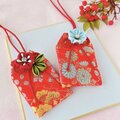 素敵なお守り袋が2つ届きました。 絞りの生地の色合いと大輪の花がとても華やかでキュートです。 白梅のものは、奥ゆかしさと気品を感じました。 どちらも大変気に入りました。大切に使わせていただきます♪