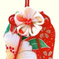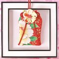 お守り袋には赤紐と柄にあわせて作ったつまみ細工の花をあわせました