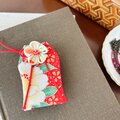 お守り袋には華やかな着物生地を使用し、赤地に白い花が描かれた部分を裁断しお守り袋に仕立てました