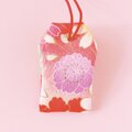 お守り袋には華やかな着物生地を使用し、赤地に紅の花が描かれた部分を裁断しお守り袋に仕立てました