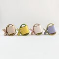 タンニンなめしのヌメ革をパープルとベージュピンクに染めあげ、イエローグリーンの縁取りを添えて仕上げました。