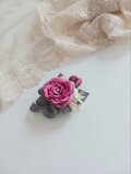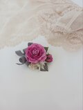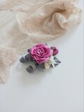 ワインカラーに染めた蕾とミニ薔薇に、小花とグレーベルベットリボンを結び、お洒落なコサージュに仕上げました。