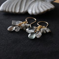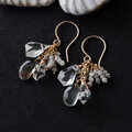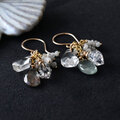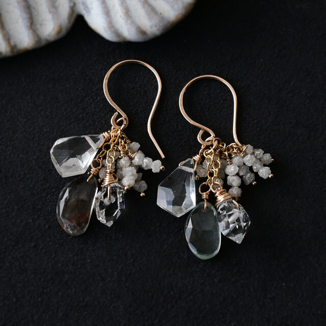 こちらは極小のダイヤの粒をフリンジにして、ラフドロップカットのホワイトトパーズ、ハーキマーダイヤモンド、ラフスライスカットのモスアクアマリンと組み合わせ、花束のような房タイプのピアスに仕上げました。クリアな石たちが美しくきらめくピアスです。デイリーにはもちろん、ドレスアップにもどうぞ。