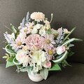 ◇アーティフィシャルフラワーで、淡いベビーピンクの陶器の花器にアレンジしました