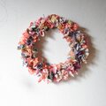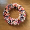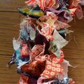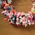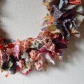 古布を細かく切り分け、手でプリーツをよせたパーツに細いワイヤーをかけてリースにまとめました。新旧様々な布を使っているので、深みのあるデザインになっています。