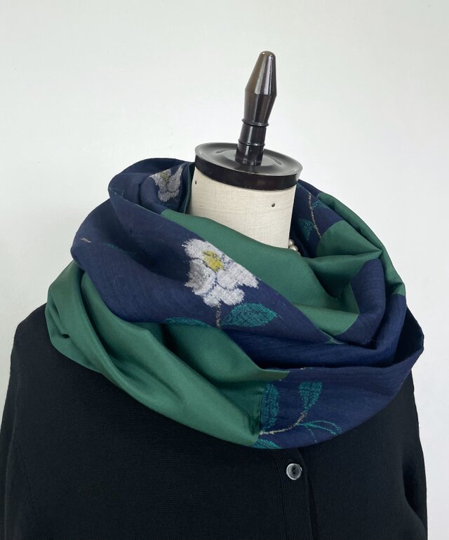アンティーク着物、白椿模様手織り真綿紬のパッチスヌードです。