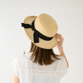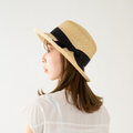 麦わらでつくった女性用の帽子。前後のつばの長さは一緒で、ツバ先を少しアップさせた軽やかなデザインです。巻き上がったブリムのエッジと角丸のクラウンが特徴で、麦わらならではの優しいカーブを描くつば先はほどよくエレガント。顔の印象を明るくし、きちんとした印象を与えます。フェミニンにもマニッシュにもどんなファッションにもはまるアイテムです。