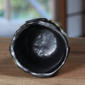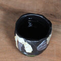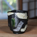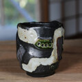 乾いたら素焼きをし、白マット釉薬・織部釉薬・鉄サビで模様を描き、全体に黒釉薬を塗り、20時間掛けて本焼きをします。