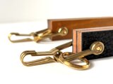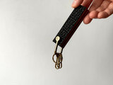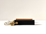 ミルフィーユの断面を忠実に再現する為、何種類もの革をパイ生地の様に重ね合わせた贅沢な構造になっています。積層した一番外側 ( 片面 )には、珍しいサメ ( 黒 ) の革や革の宝石と呼ばれるルガトー ( マスタード )と呼ばれる革をあしらった高級仕様になっています。一枚一枚丁寧に圧着していき、ケーキをカッティングする時のように真っ直ぐに裁ち落とすことで、美しい断面を実現しました。耐久力を上げる為、断面もしっかりと磨き上げています。使用頻度の高い鍵をスムーズに取り出せるようにコナスを二つ付け、その他の鍵やお好みのチャームを追加でカスタム出来る二重丸カンを採用。機能的な面に加え、遊び心のある太めの真鍮シャックルを付けました。革とは疑ってしまう佇まいは職人が一つ一つ貼り合わせているもので、同じ断面は一つとしてなく、唯一無二の一点ものです。