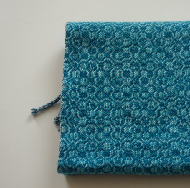 トルコブルー、ピーコックグリーン、生成りを組み合わせて織りました。