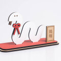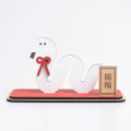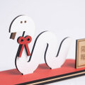かわいらしい巳年の置物です。白と赤のおめでたい色が特徴で、お正月の祝いや子供やお孫さんへのプレゼントにも最適な作品です。お部屋や玄関に飾ると、かわいいアクセントとなり、空間を楽しく彩ります。組み立て式で、パーツを土台に立てることで完成します。