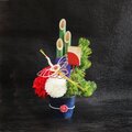 江戸切り紐の紫と、ピンポンマムの おめでたい紅白、陶器の深い藍のコントラストが美しい門松です
