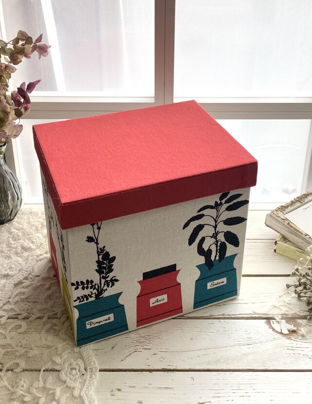 赤いフタが印象的な北欧柄の瓶モチーフが並ぶアルメダールスファブリックを使用し遊び心を感じる佇まいに仕立てました。
