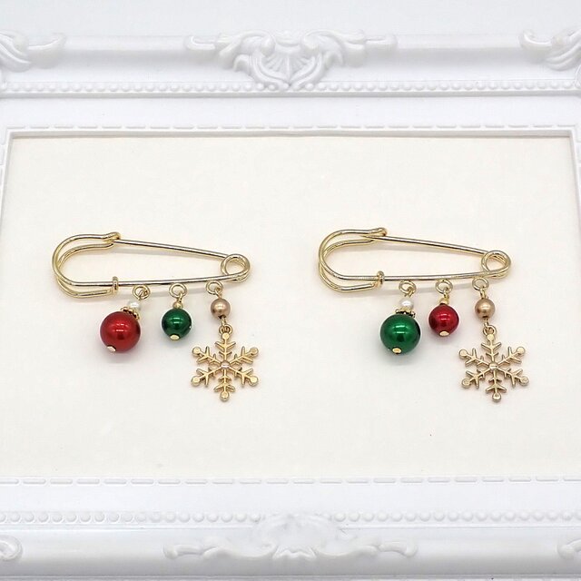 華やかな色合いのクリスマスカラーのパールと雪のチャームが揺れる大人可愛いクリスマスブローチです。